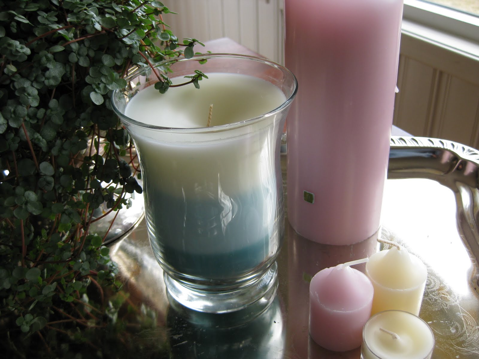 Det var ett stort rosa kubbelys, ett stort med blåtoner i glass, 1 pk med te-lys, og små-kubber i to luktvarianter.